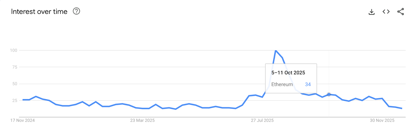 Google Trends surged during the July-September period, in line with the momentum of ETH DATs and ETFs. Traditional routes to owning Ethereum sparked retail curiosity. Curiosity brought attention.