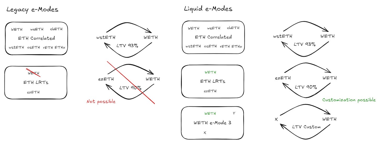 When a protocol wanted to support assets with different risk profiles, it did not adjust interest rates or collateral costs in a granular way. It created separate markets instead. Assets considered safe were grouped into one market. Newer or riskier assets were placed into isolated markets with lower limits. Higher-leverage strategies were pushed into special modes, such as E-mode. It was designed for assets that move closely together in price, such as stablecoins or liquid staking tokens. Because these assets are highly correlated, the protocol allowed users to borrow more aggressively against them.