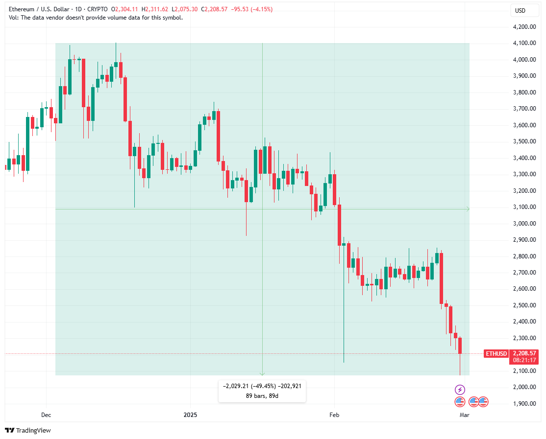 After briefly touching $3,000 in early February, ETH has steadily declined, with the sell-off accelerating dramatically this past week. The 22% monthly drop leaves Ethereum trading at less than half its all-time high of $4,878 set three years ago.