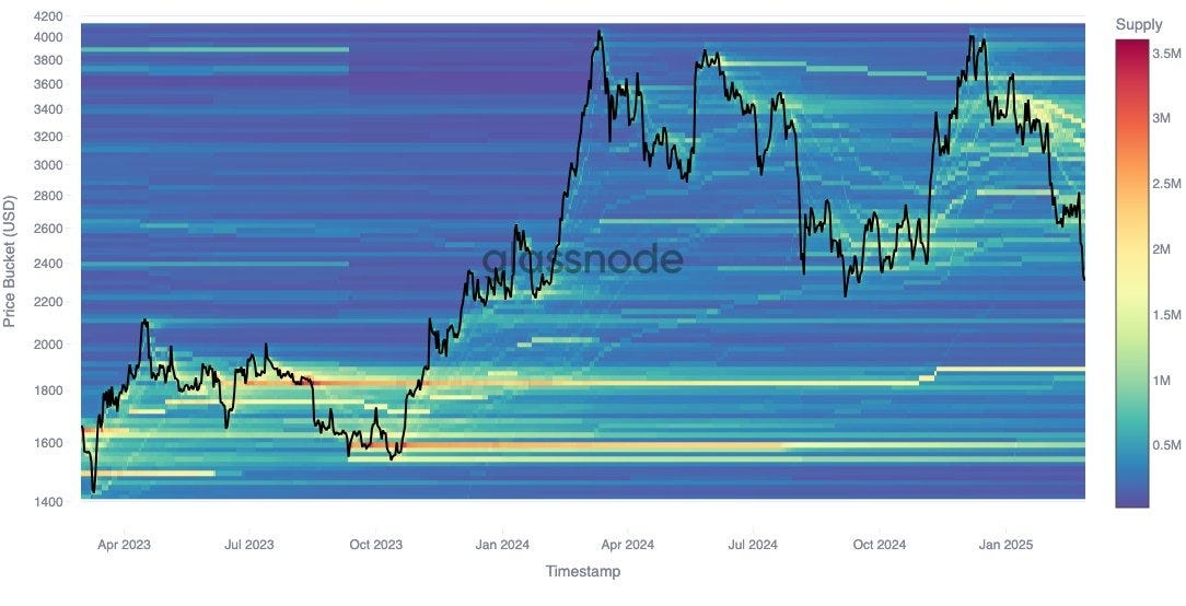 On-chain analysis from Glassnode points to a lower critical support level at $1,890. Their Cost Basis Distribution data reveals a massive accumulation zone of 1.82 million ETH at this price point — nearly 10% below current levels.