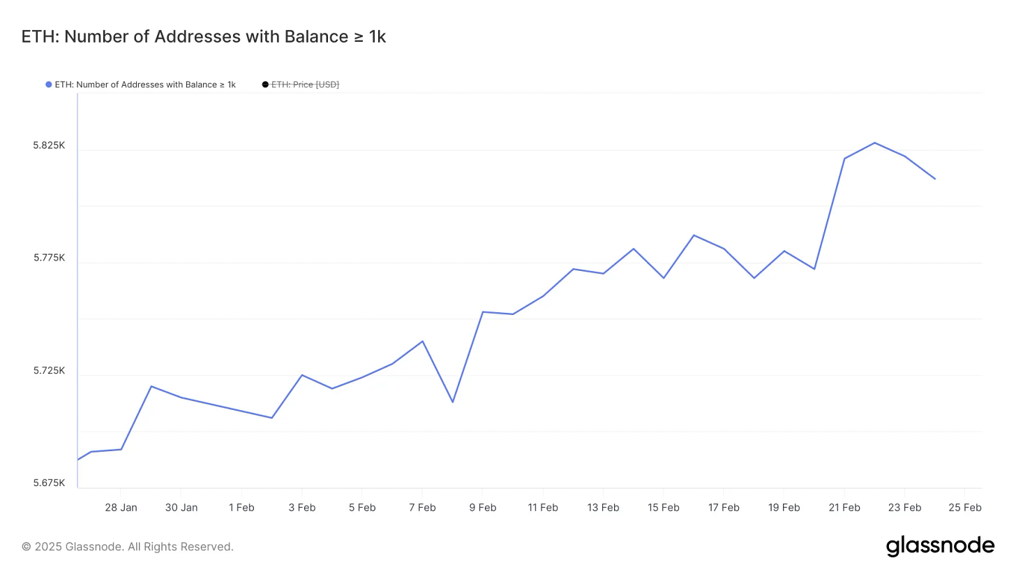 The number of Ethereum whales — addresses holding at least 1,000 ETH — had been steadily increasing throughout January, reaching 5,828 on February 22, the highest level since February 2024. This upward trend abruptly reversed over the past few days, signalling that large holders have begun reducing their positions.