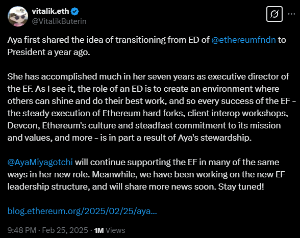 "These past few weeks have illuminated something profound about Ethereum. This new opportunity will allow me to continue supporting EF's institutional relationships, and to expand the reach of our vision and culture more broadly," Miyaguchi wrote, framing the transition as planned for over a year.