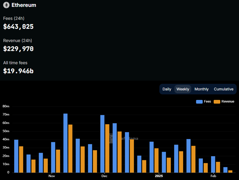 An added concern for Ethereum's fundamental value proposition: transaction fees have plummeted 70%, hitting their lowest levels since 2020. The 7-day moving average fell to just $0.77 on February 15, down from $2.57 a week earlier.