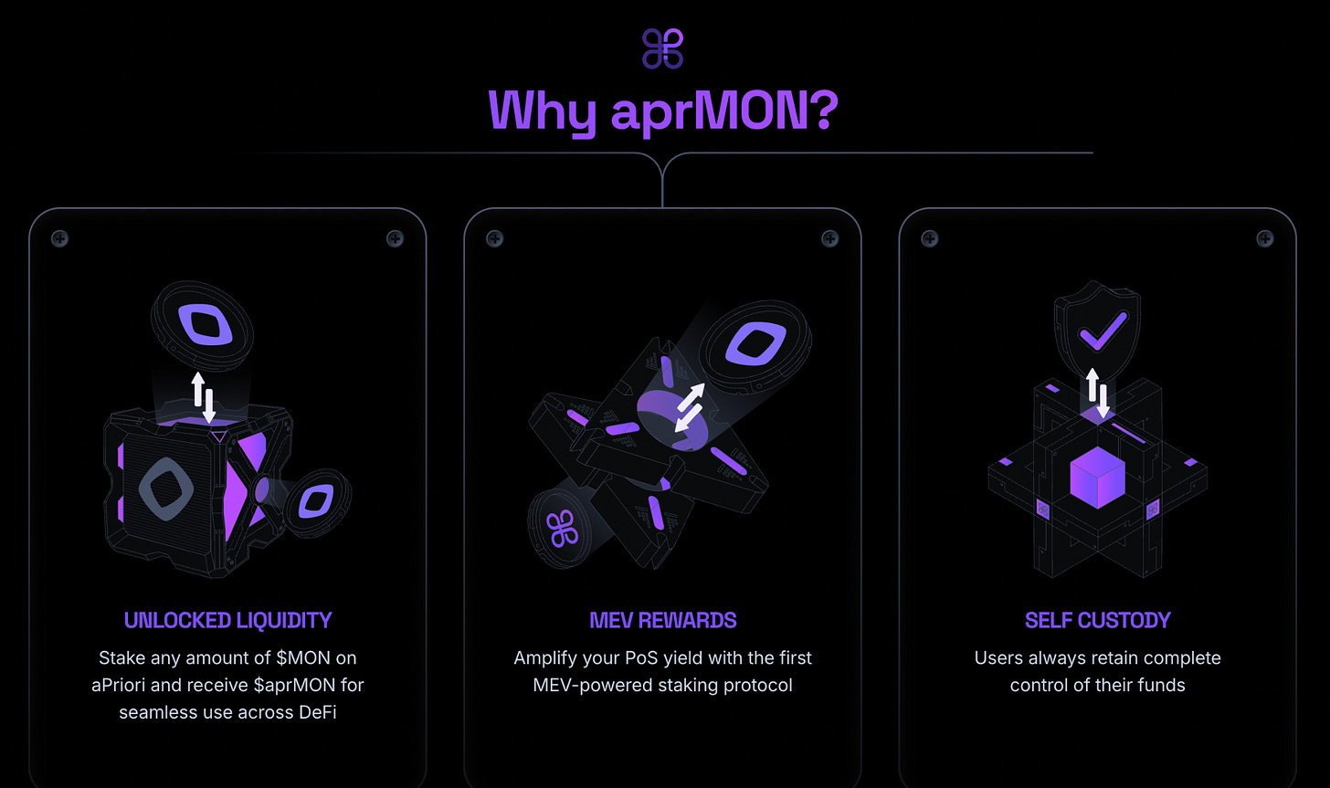 On Monad specifically, competitors include Magma and Kintsu, both offering liquid staking. The differentiation comes from aPriori’s MEV integration and the team’s trading infrastructure background.