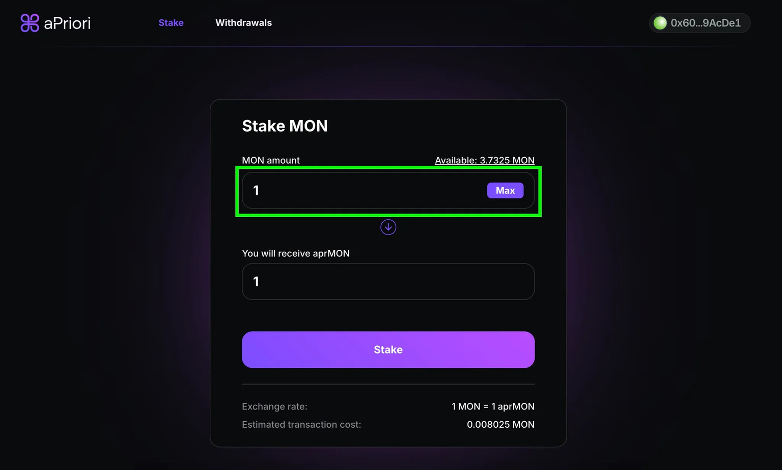 Getting started requires connecting a Web3 wallet to the aPriori interface at apr.io. You deposit MON tokens and immediately receive aprMON representing your position. The interface shows expected yields from both staking and MEV capture, though actual returns vary with network performance.