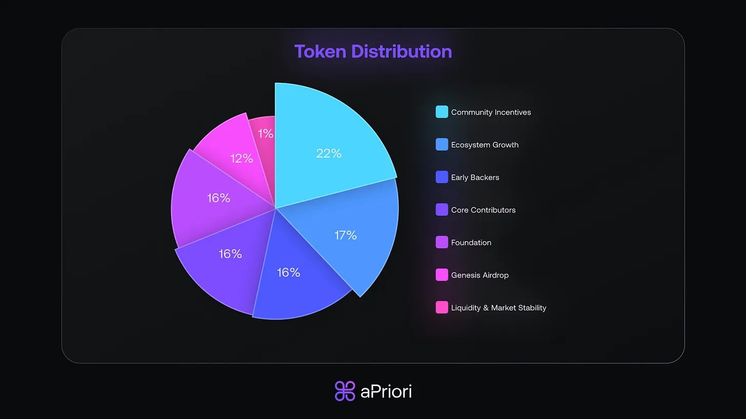 APR token economics: 1 billion fixed supply, 185 million currently circulating. Distribution includes 16% to early backers (3-year vesting, 1-year cliff), 16% to core contributors (4-year vesting with 1-year cliff), 16% to foundation operations, 12% to Genesis Airdrop, 22% to community incentives, 17% to ecosystem growth, and 1% to liquidity.