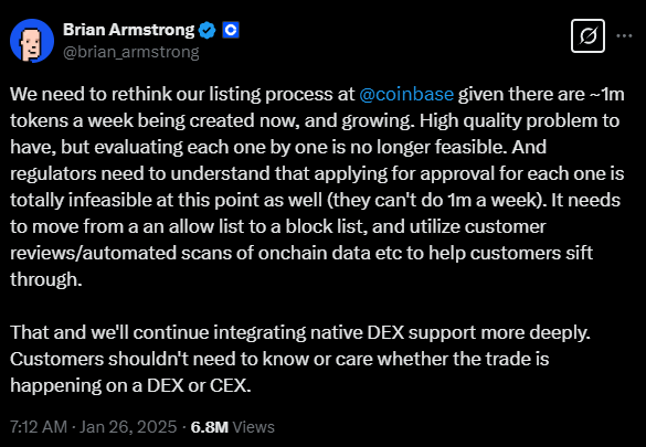 Coinbase CEO Brian Armstrong recently admitted that evaluating the estimated one million tokens created weekly is "totally infeasible," suggesting a move toward a crowdsourced approach similar to Twitter's Community Notes.