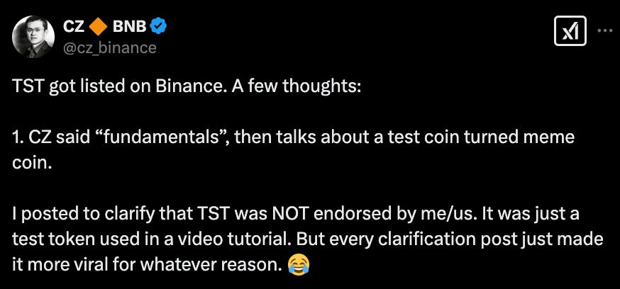 Welcome to crypto in 2025, where even the test tokens go viral and the world's largest exchange gets called out by its own creator.