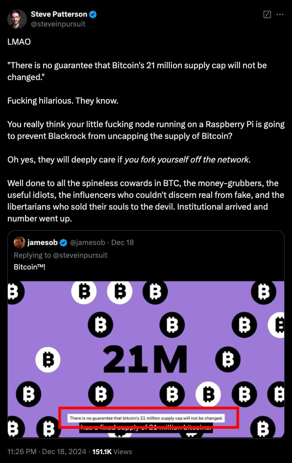 "The inflation cap is definitional to Bitcoin … eliminate that, and whatever you have isn't Bitcoin anymore. You might as well ask what it would take to turn Bitcoin into PayPal."