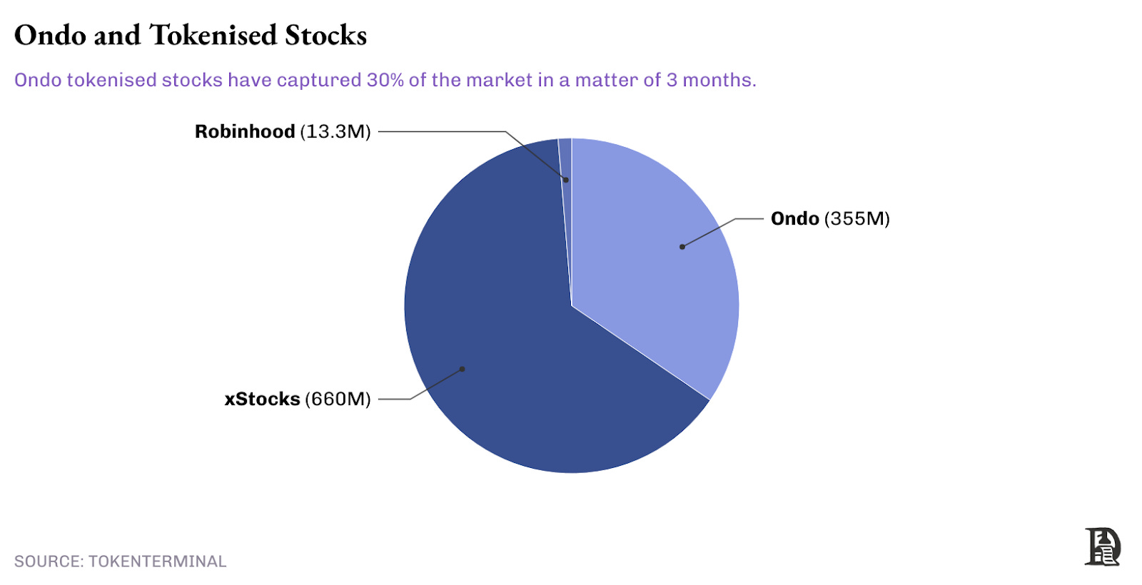 Three months in, Ondo has issued about 103 stocks, ETFs and indexes on-chain. The total TVL of these tokens is a whopping $355 million - approximately 30% of the total tokenised equity market.