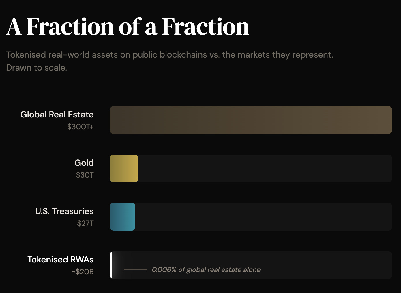 These are meaningful milestones for crypto but tokenisation has captured a fraction of a fraction of the world’s assets. The global gold market exceeds $30 trillion. The U.S. Treasury market is $27 trillion. Global real estate sits north of $300 trillion. It remains, by any honest accounting, early.