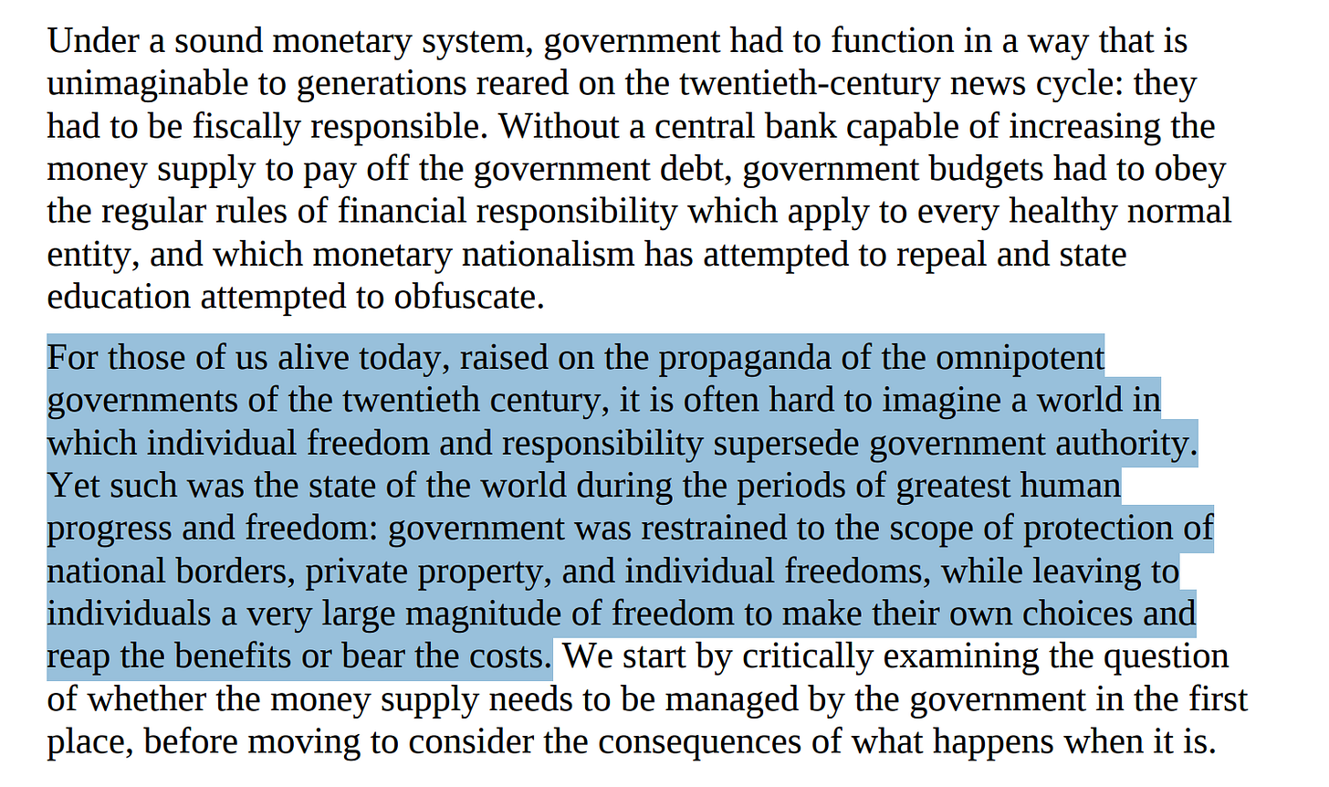 Where I start to push back is when he makes that the main axis for everything. It is not. States are not just the thing that prints. They also build legal systems, enforce property rights, and coordinate some non-trivial bits of civilisation. You can complain about how they fund themselves (and you should), but opting out of the monetary system is not a magical replacement for politics.