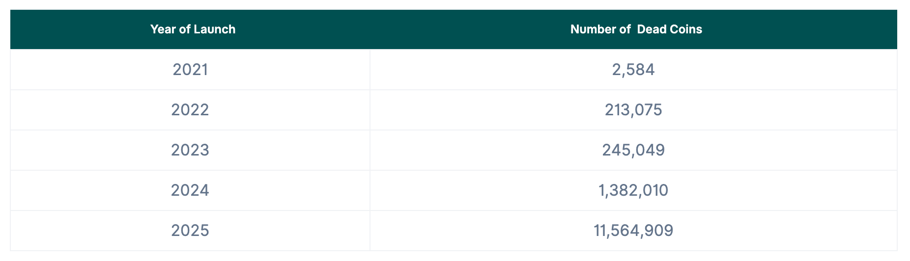CoinGecko data shows that 86% of the 11.5 million tokens launched in 2025 went to zero. Not “performed poorly.” Went to zero. Trading volume disappeared. The projects either never had a real product or could not sustain interest after the initial hype faded.