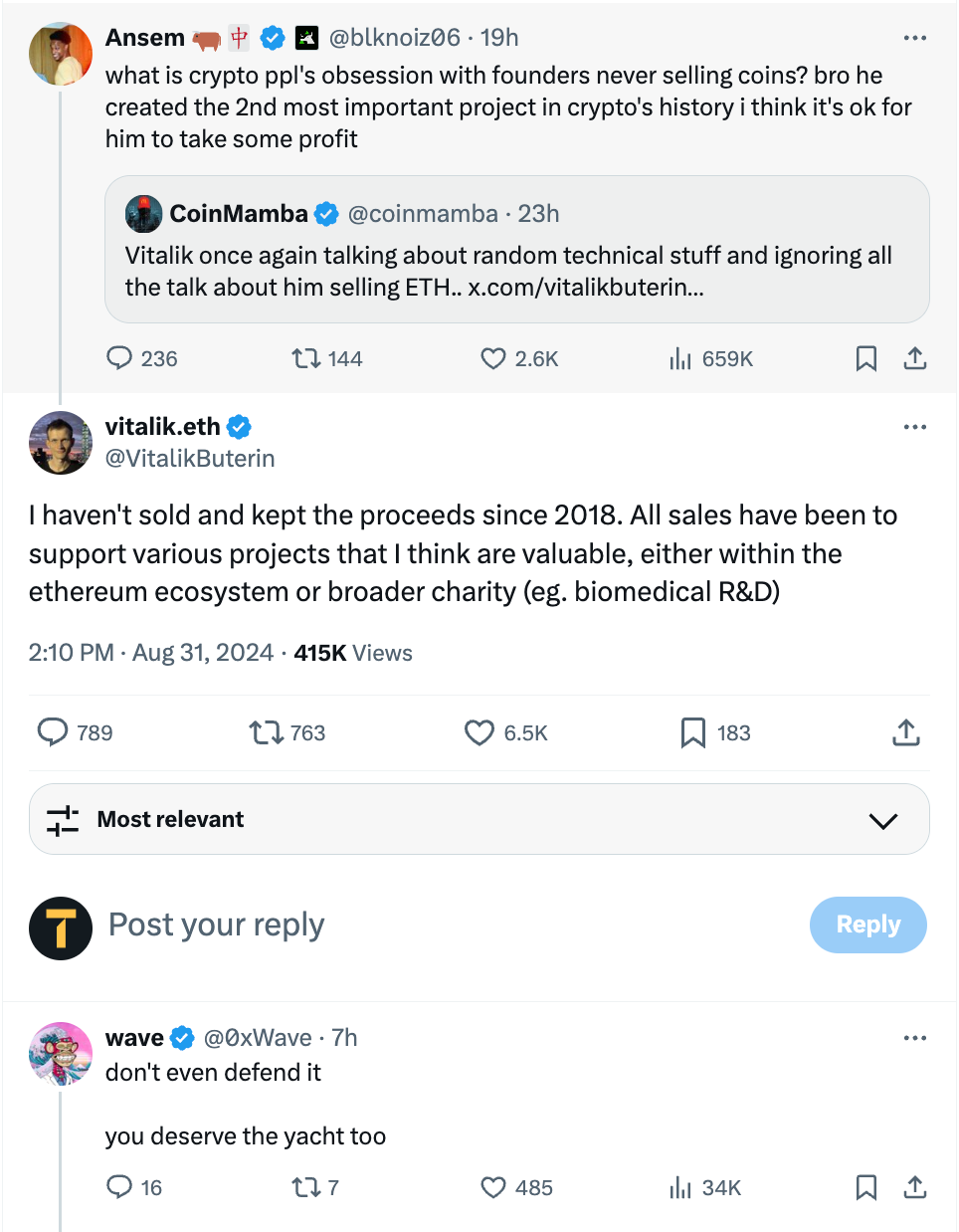 The crypto community largely rallied behind Buterin, with widespread support for Buterin's right to benefit from his contributions to Ethereum.