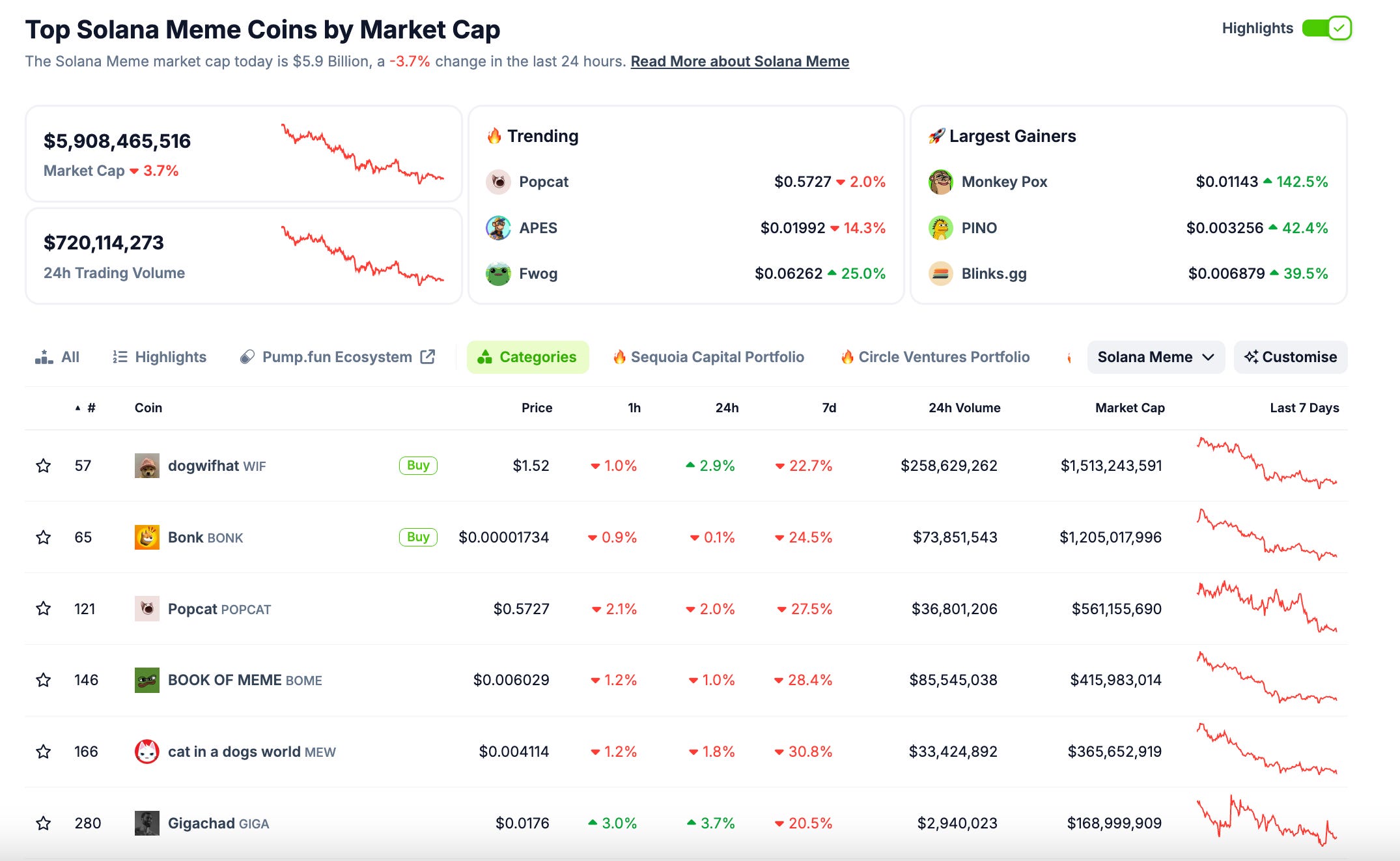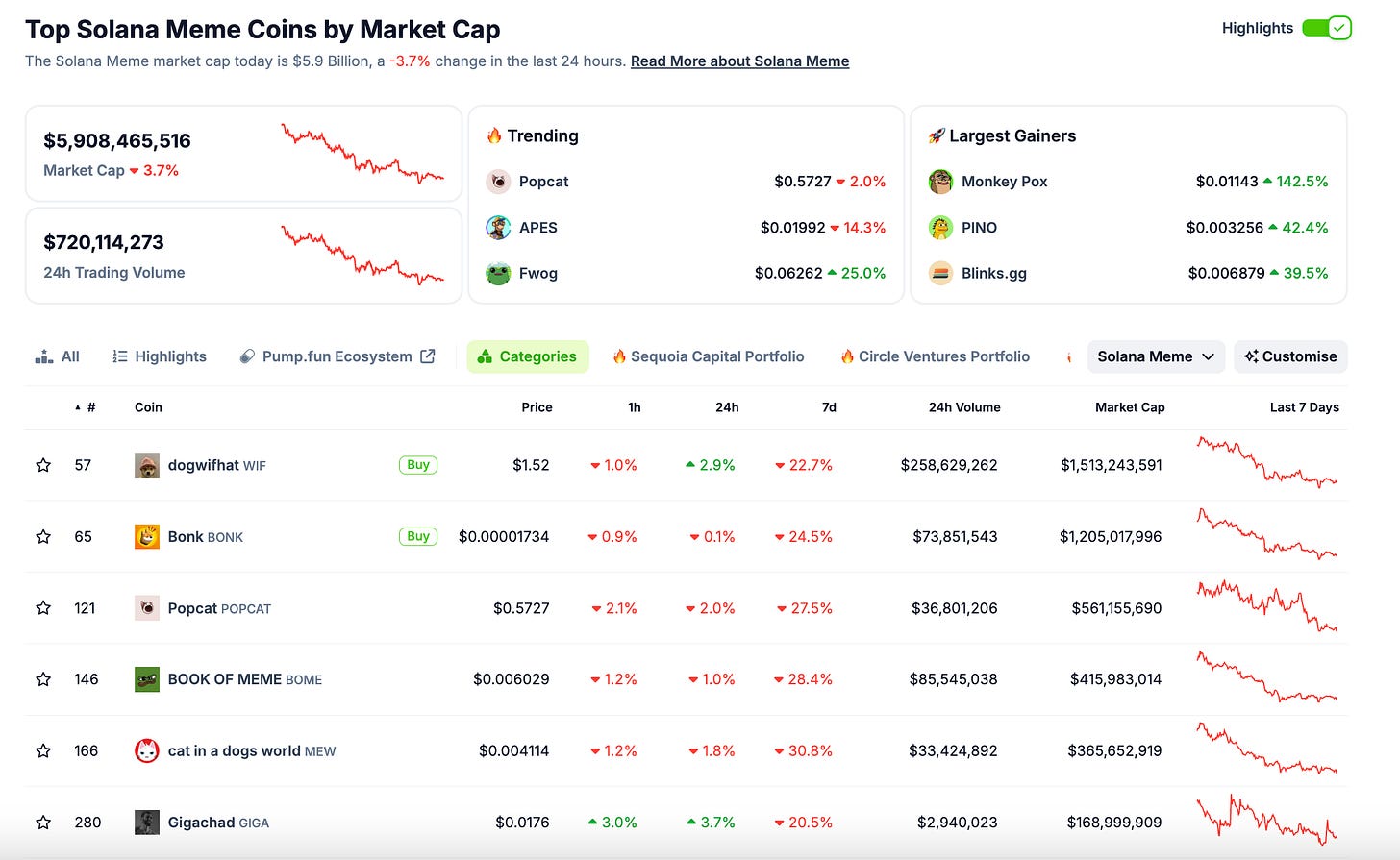 As of August 2024, memecoins on Solana have a combined market cap around $6 billion.