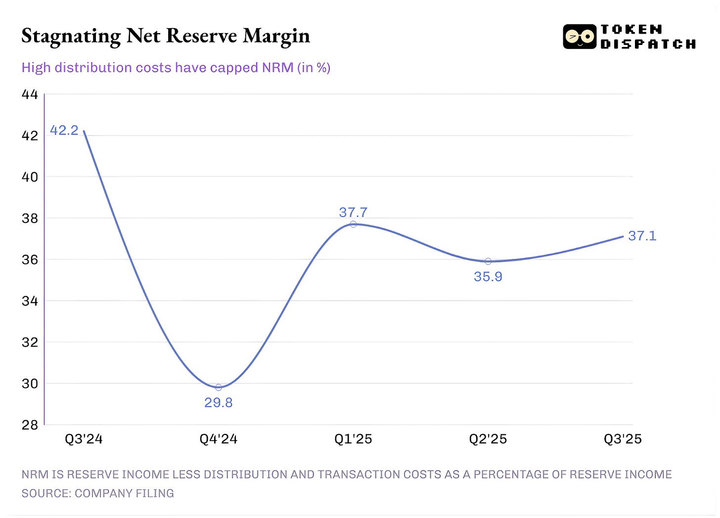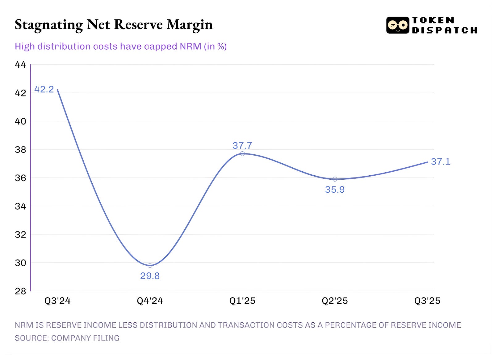 Circle has scaled its market share over the past couple of years through massive distribution. For every dollar of reserve income it earned, it had to burn 60 cents as distribution and transaction costs. That’s the share of revenue it paid to exchanges like Coinbase and other wallet partners that help distribute USDC and increase its circulation.