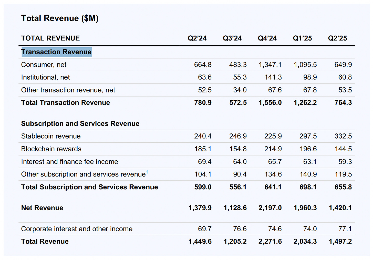 But by 2025, being “the on-ramp to crypto” started to look like a bad business. Spot trading fees were compressing. Retail trading volume was wildly cyclical, spiking during bull runs and collapsing during bear markets. Bitcoin maxis were increasingly comfortable using self-custody wallets. Regulators were still suing the company. And Robinhood, which started as a stock trading app and crept into crypto, was suddenly worth $105 billion, nearly twice Coinbase’s market cap. Coinbase’s revenue in 2021 was over 90% transaction-based. By Q2 2025, that number had fallen below 55%.