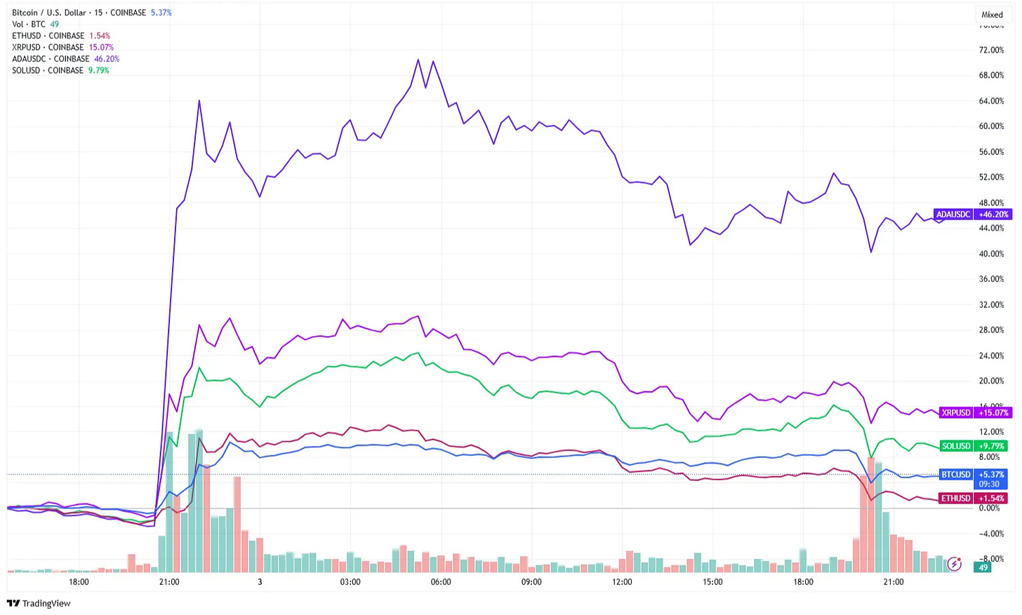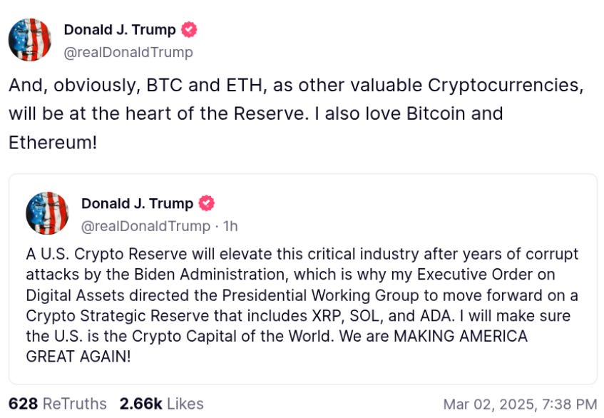 Ki Young Ju, CEO of CryptoQuant, said it bluntly: "Trump mentioned XRP, SOL, and ADA first, then brought up BTC and ETH two hours later. Can I interpret his tweets this way? 'BTC and ETH, show me your strategic value—for me and the USA. I just closed a deal with XRP, SOL, and ADA.'"