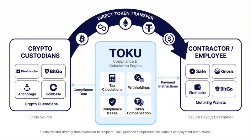 The most concrete answer is Toku. Toku is an Employer of Record (EOR) platform built specifically for companies paying distributed teams. They handle tax withholding in each jurisdiction, local employment contracts, labor law compliance, and real-time FMV calculations for token-based compensation. On January 29, 2026, Toku integrated Aleo’s infrastructure and added USAD as a payroll settlement currency. A company using Toku can now run payroll across 100+ countries in stablecoins with full compliance in each jurisdiction and without any of that payroll data going onto a public ledger. Toku handles the compliance layer, USAD handles the settlement, and Aleo handles the privacy. The company’s existing payroll software doesn’t change.