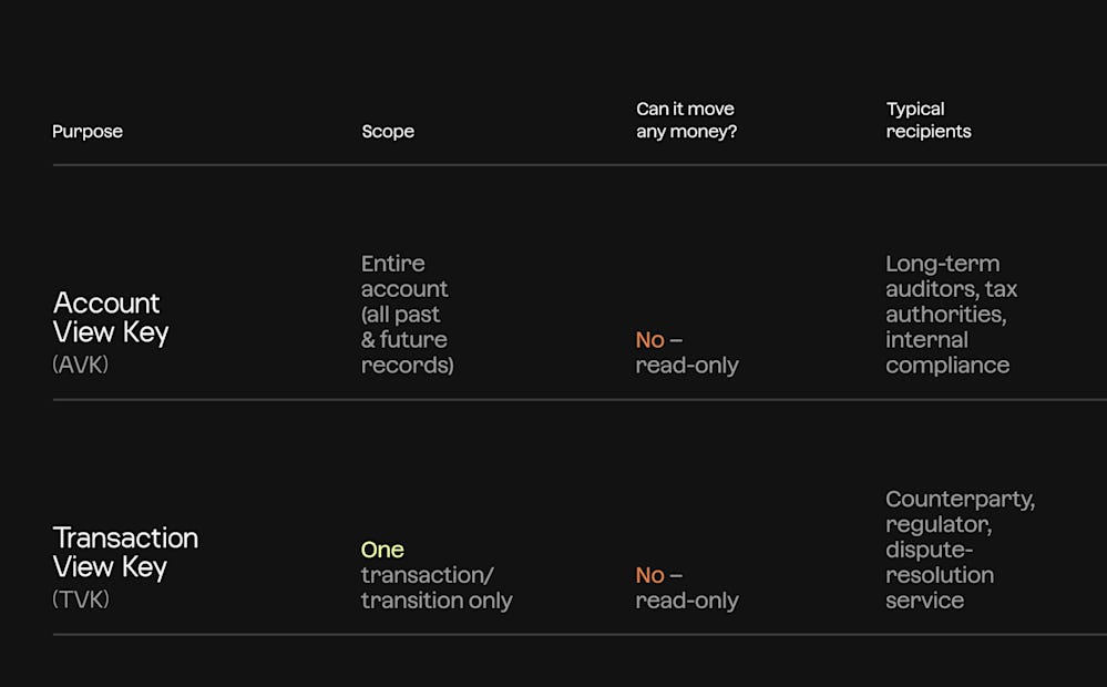 There are two types. An Account View Key gives read-only access to an entire account’s history, past, and future. You can hand this to an auditor, a tax authority, or an internal compliance officer at the start of the year, and that authority can verify everything they need throughout the year without the company having to produce records on demand. They can see everything they need, but cannot move any funds or modify anything. And the key is derived from the user’s private key in a way that makes it mathematically impossible to reverse-engineer access to the actual funds.