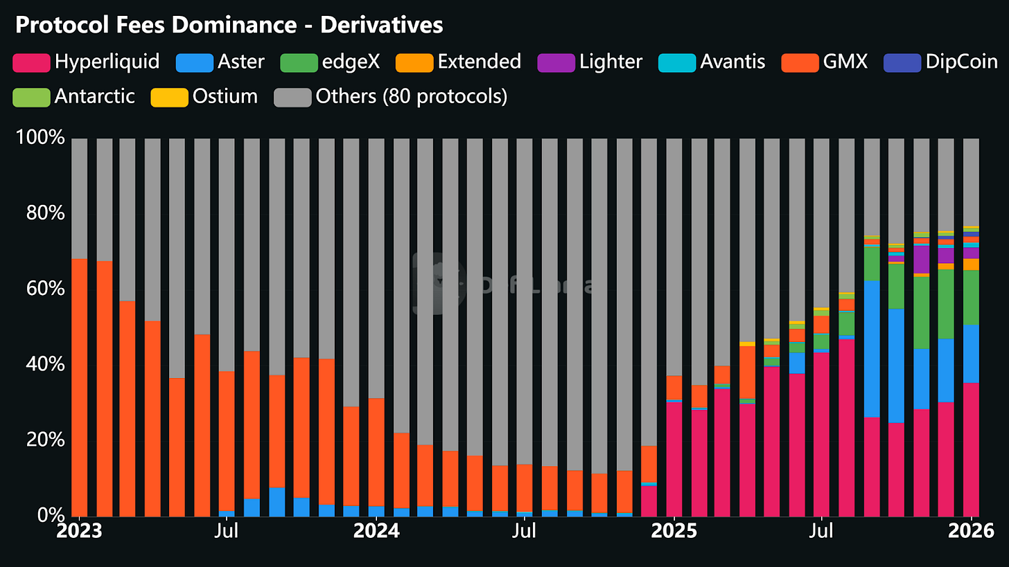 In 2025, Hyperliquid dominated the perp DEX space by offering ample liquidity enabled by the largest number of market makers on the platform. As a result, Hyperliquid was the most dominant perp dex in terms of fee collection in 10 out of the 12 months last year.