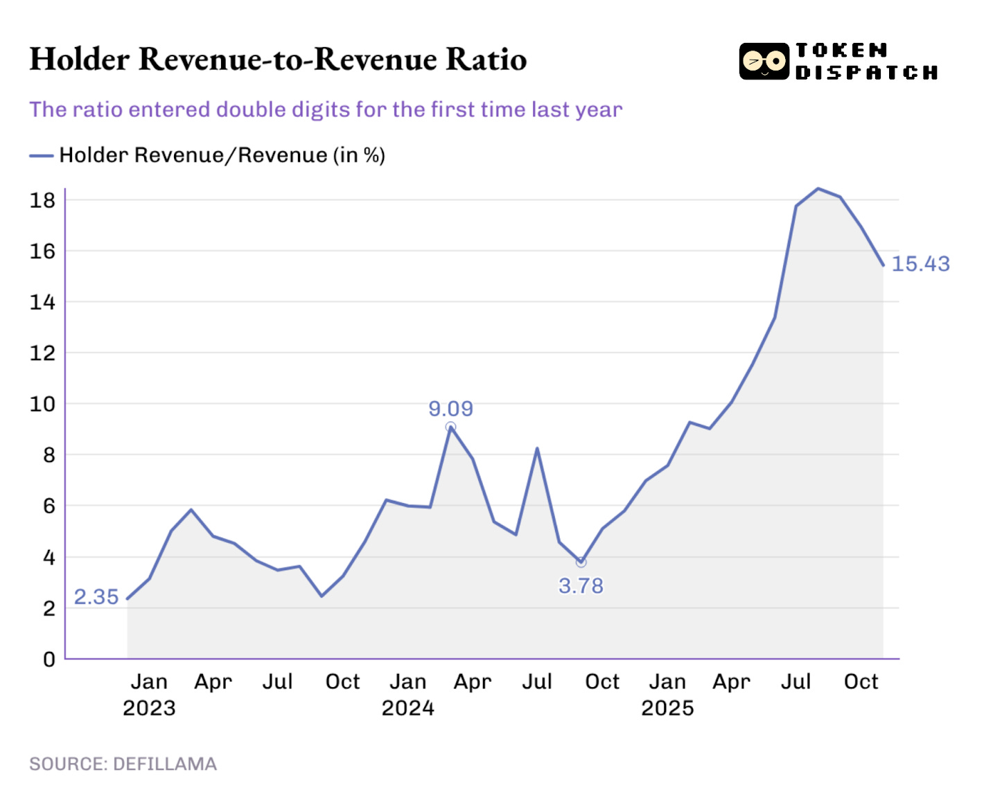 The holder revenue as a percentage of the total revenue earned by the protocols has ticked up consistently through the last year. It surpassed the earlier record high of 9.09% early last year and even crossed 18%, at its peak in August 2025.