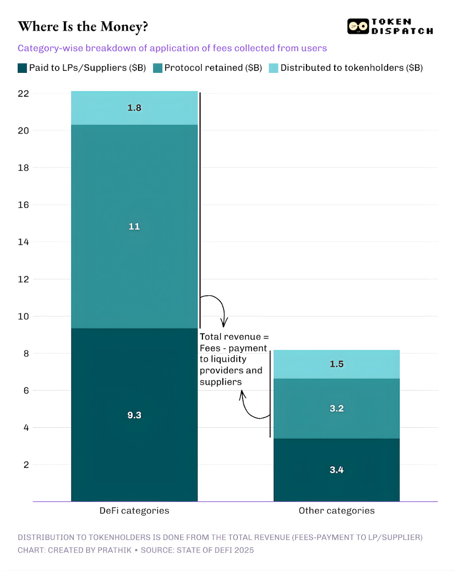 In 2025, users across DeFi and other protocols paid roughly $30.3 billion in fees. Of that, $17.6 billion was retained by protocols as revenue after paying liquidity providers and suppliers. About $3.36 billion of total revenue was returned to tokenholders through staking rewards, fee sharing, buybacks, and token burns.