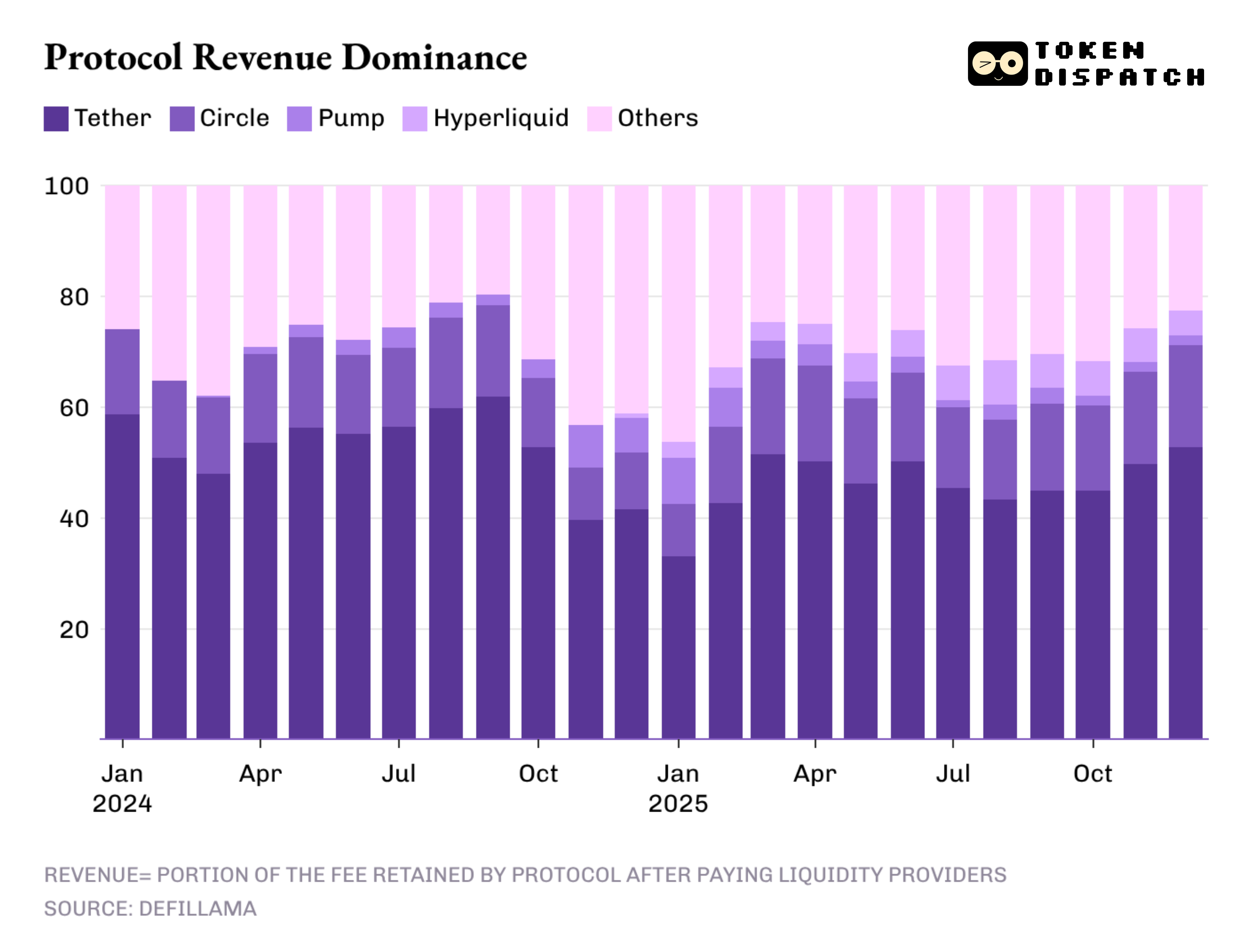 The top two stablecoin issuers, Tether and Circle, accounted for over 60% of all revenue generated in crypto throughout the year. In 2025, their share dipped only marginally to 60% from about 65% the previous year.