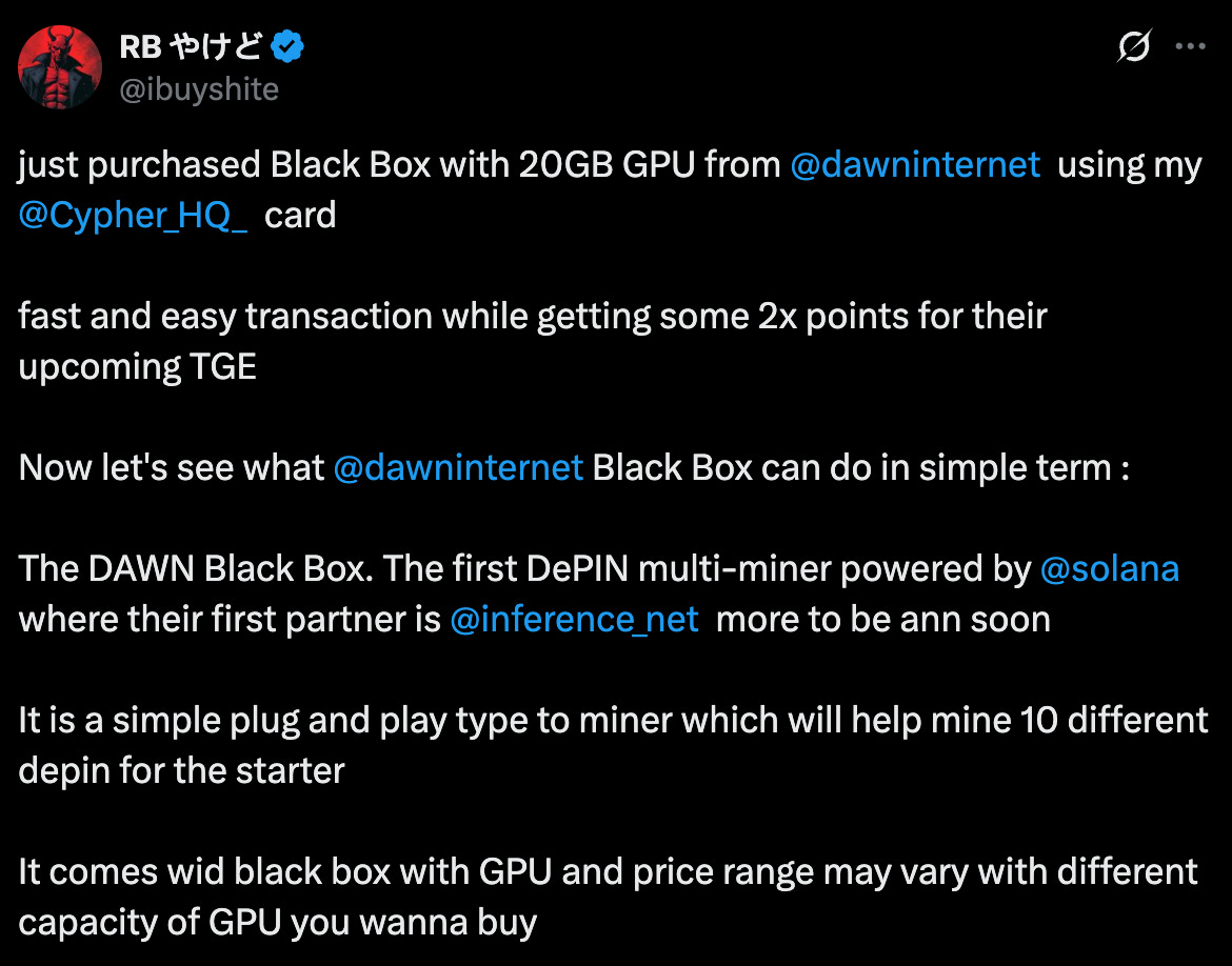 It powers your own node in the decentralised wireless network. The Black Box is a specialised hardware unit with a software router, self-hosted server, AI edge computing capabilities, and high-speed networking features designed for running DAWN and other DePIN (Decentralised Physical Infrastructure Network) projects. Yes, not just DAWN.