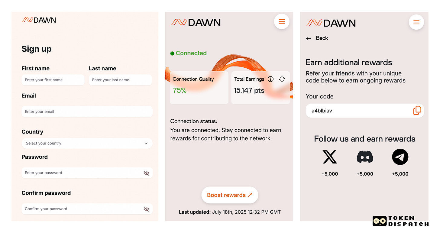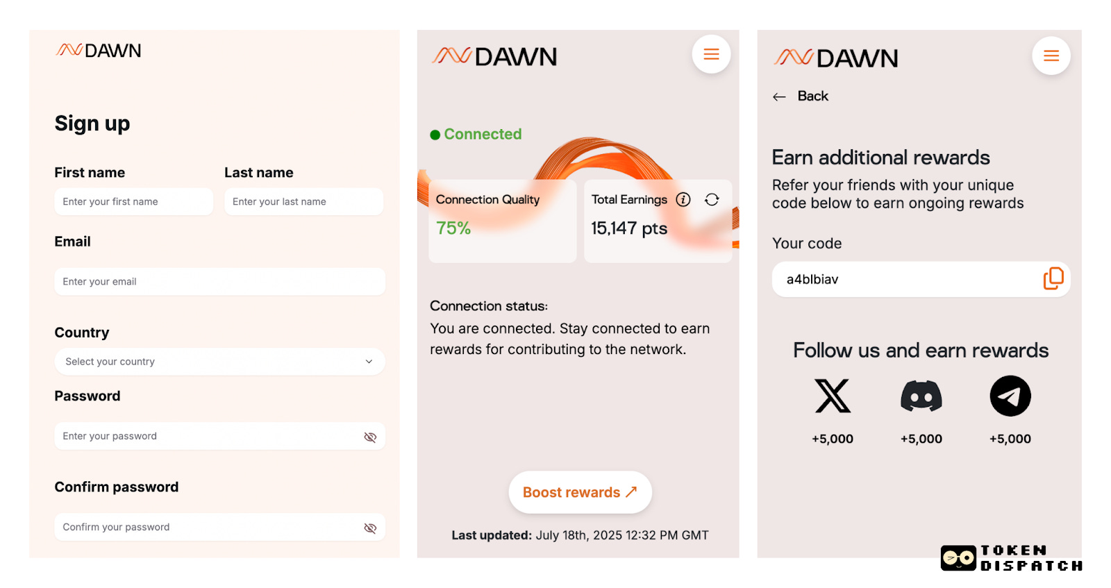 Boost Earnings: Follow DAWN social accounts, refer friends for 20% of their rewards