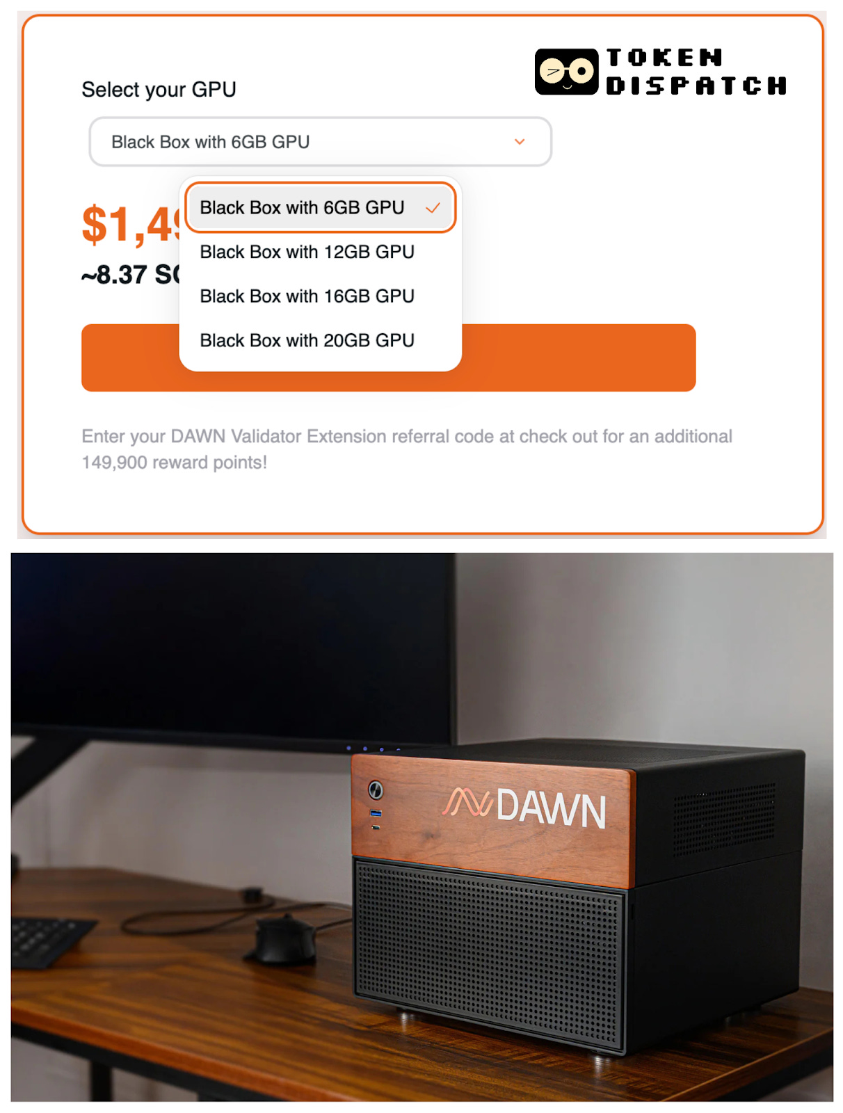 You can choose different configurations (such as GPU options) at checkout (price differs accordingly), and the device is available directly from the DAWN Store, or through authorised partners. When ordering, you can optionally use your DAWN Validator Extension referral code for additional rewards.