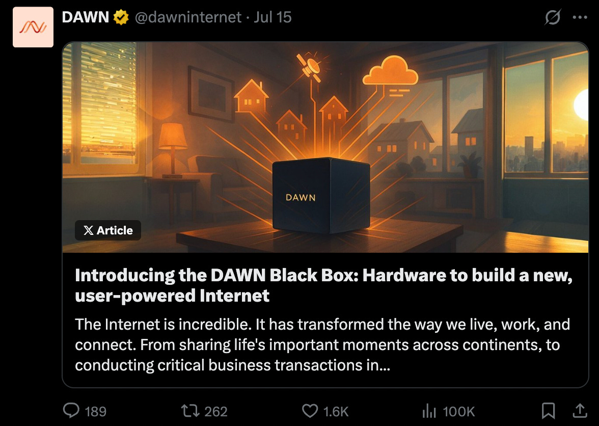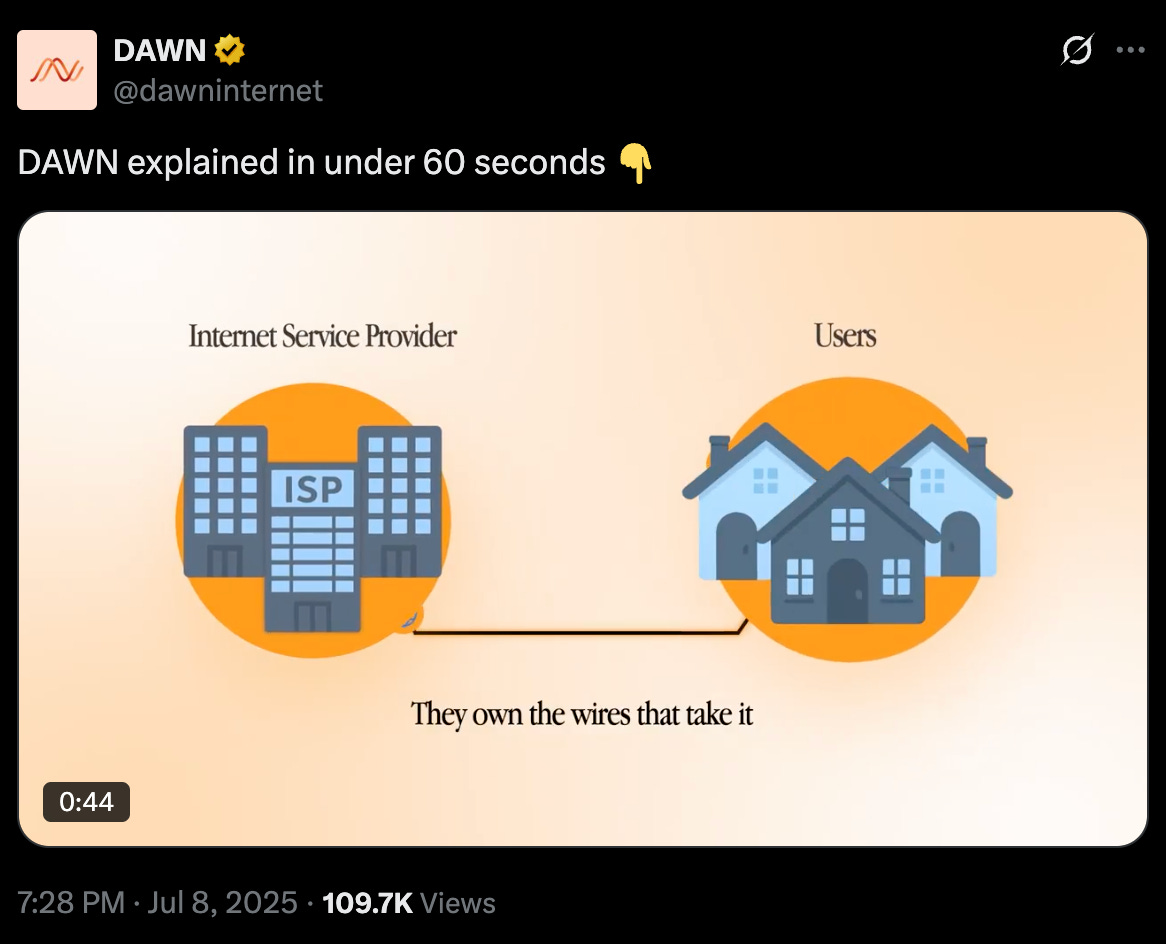 DAWN Internet built infrastructure that makes this oligopoly irrelevant. A Solana-based DePIN protocol that turns households into micro internet service providers, complete with cryptographic proofs to ensure service quality and fair compensation.