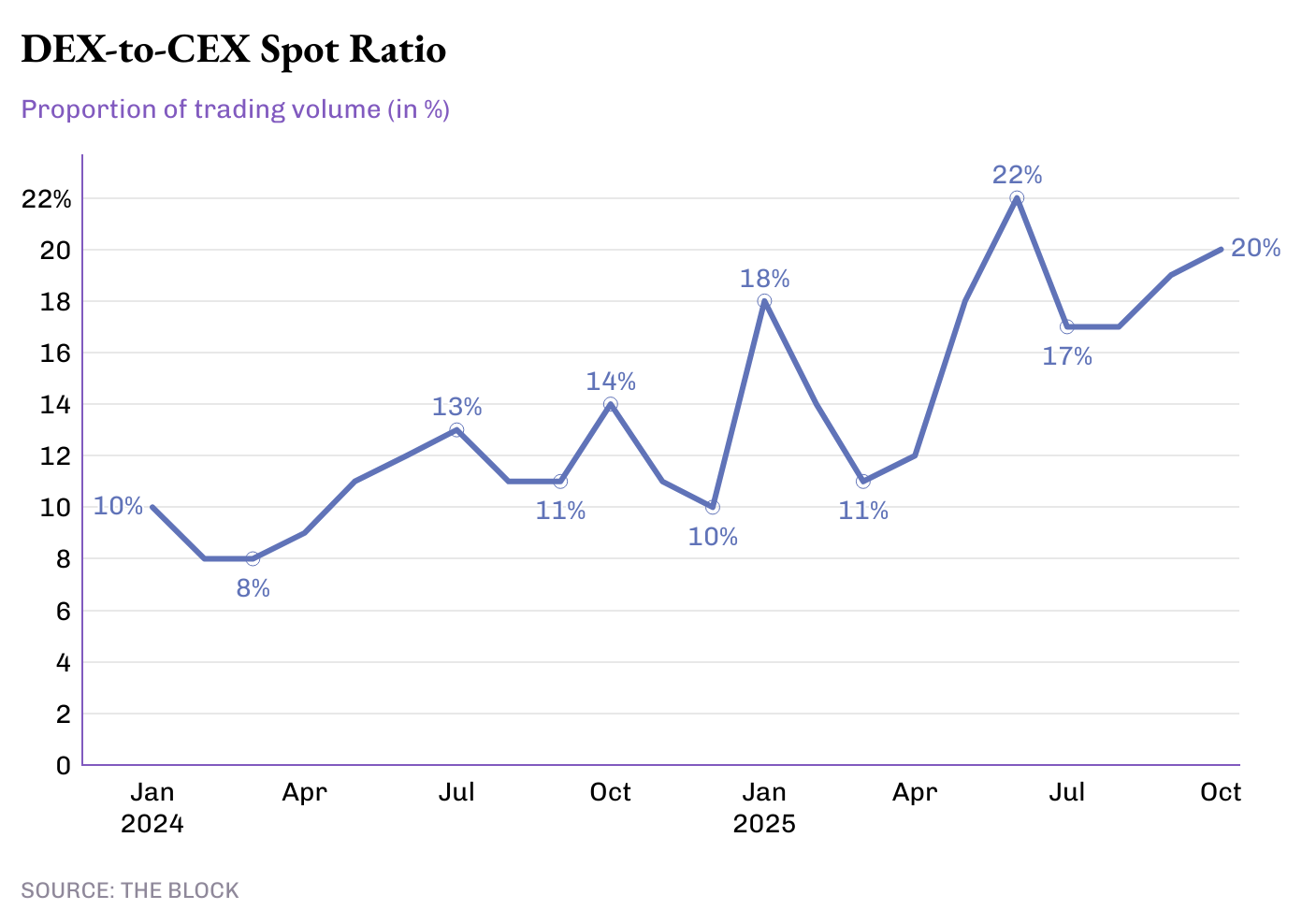 So far this year, DEXs have accounted for nearly 20% all spot volume, up from just over 10% in 2024. While CEXs still dominate the markets due to fiat ramps, DEXs have become the default choice for those seeking speed, composability, anonymity and self-custody.