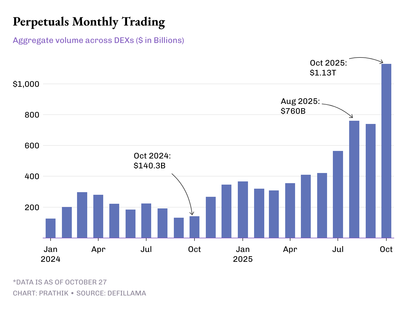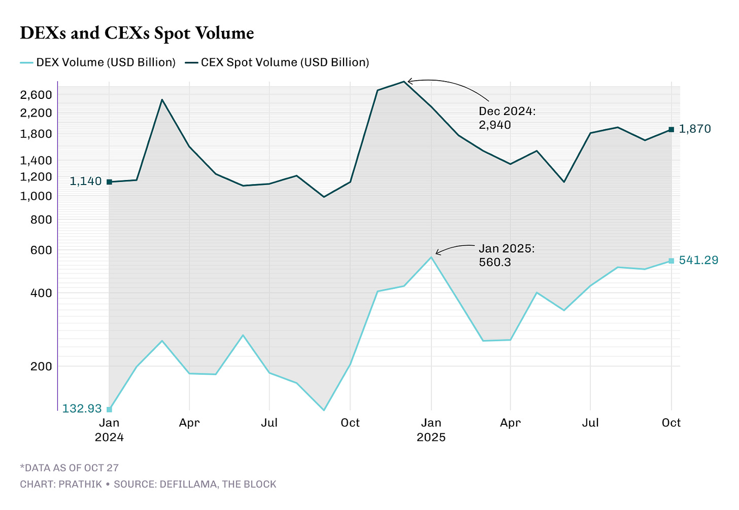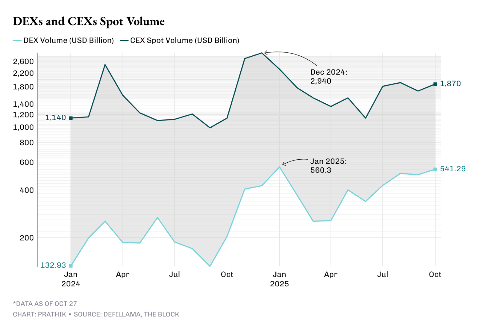 For Q1 2025, DEXs averaged $395 billion in monthly volume, followed by $332 billion in Q2. By Q3 2025, the average had jumped 50% to $480 billion in monthly volume. In October, the volume has already surpassed $540 billion with four days to go.