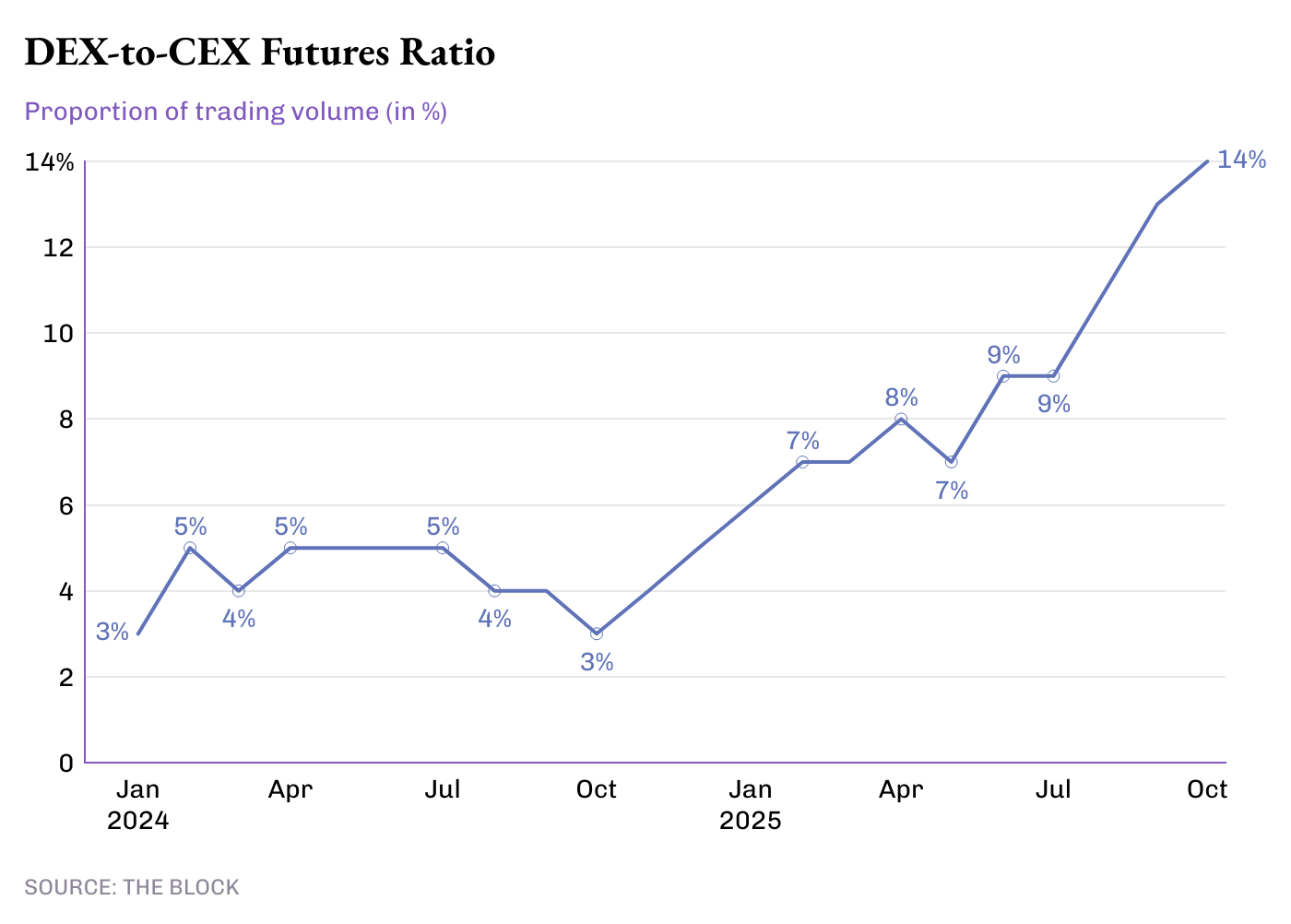 In 2024, decentralised perps handled less than 5% of global futures turnover. By mid-2025, that number had doubled to 10%, and by October, it had reached 14.3%, the highest-ever share of on-chain derivatives relative to CEXs.