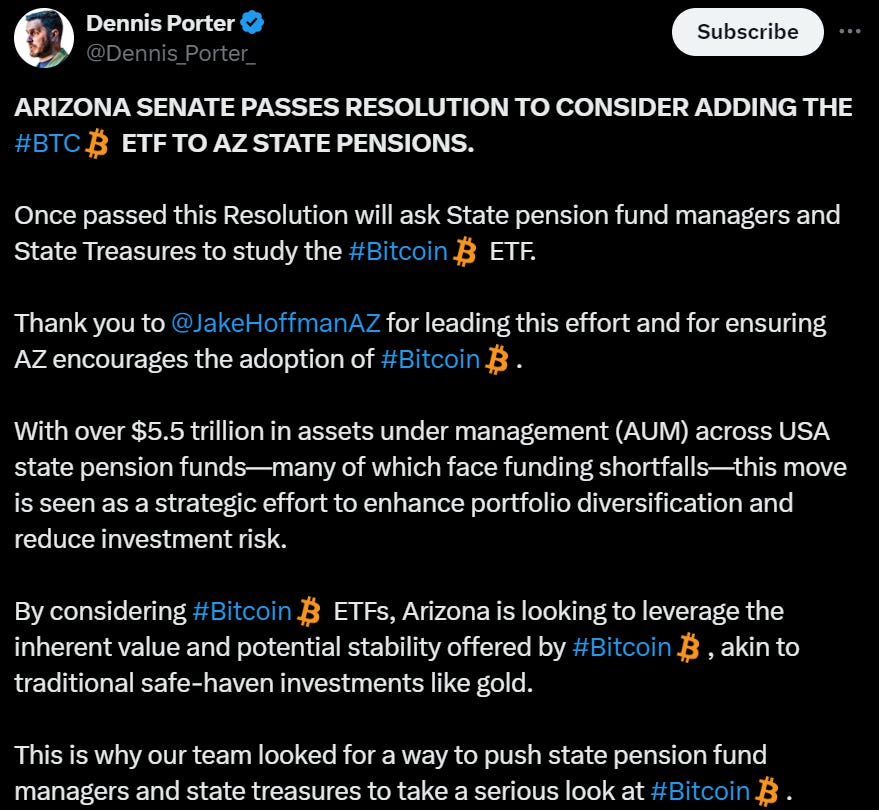 The Arizona State Senate is considering a proposal to allow the state's retirement systems to explore Bitcoin ETF investments.