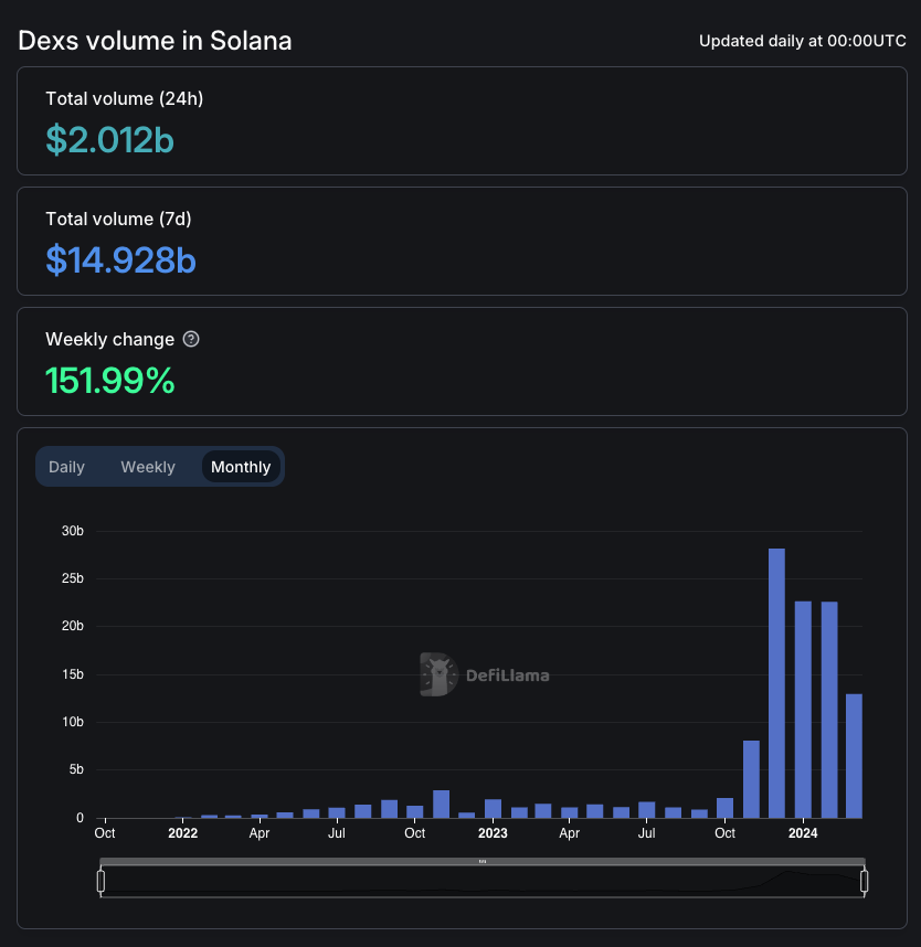 The DEX trading volume on the Solana has exceeded $2 billion for four days,