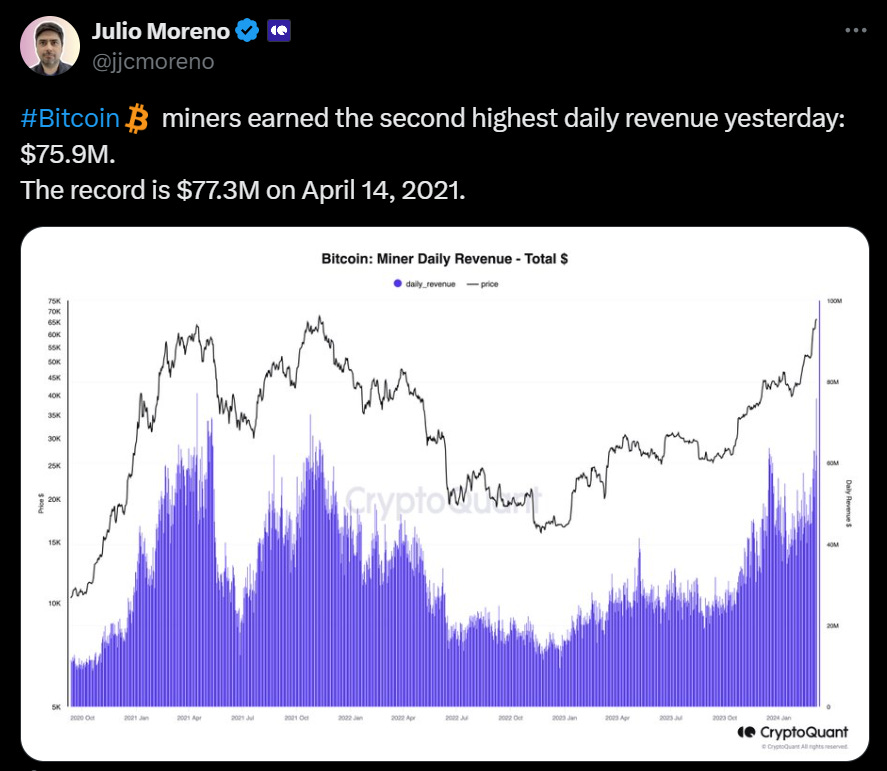 Bitcoin miners just had their second-best day ever, raking in $75.9 million.