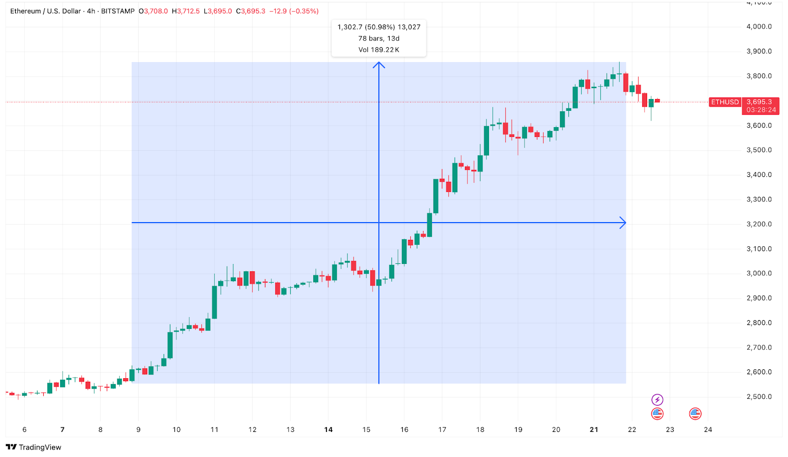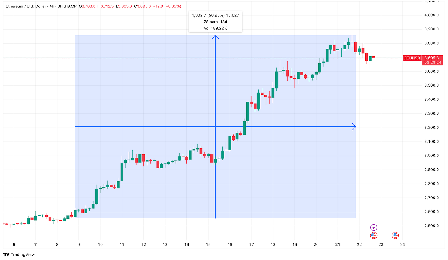 ETH price has already shot up over 50% in just the last two weeks and recorded a yearly high for 2025. It rose 150% in the last three months.