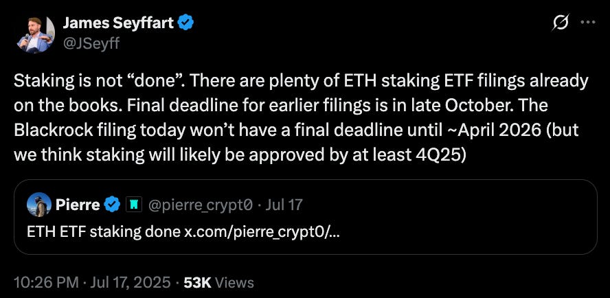 BlackRock is already exploring staking-inclusive structures. It submitted an amended 19b-4 filing that explicitly mentioned staking as a âpotential future featureâ contingent on regulatory approval. The market is waiting.