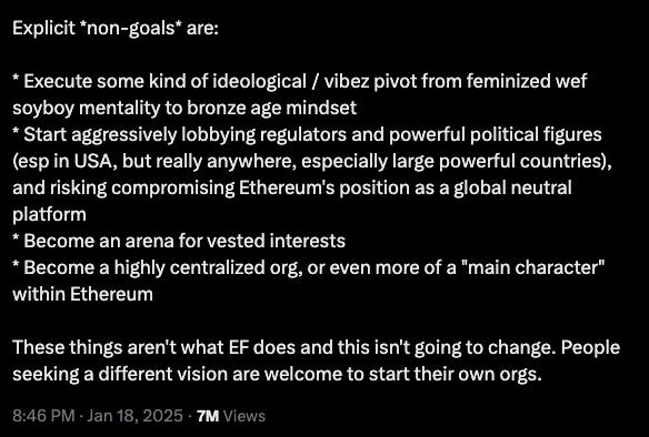 "The Ethereum Foundation is a paradox. Despite its commitment to decentralisation, it operates as a centralised entity, with a director, a treasury, paid developers, and an inner circle. These structures, while necessary for coordination, create tensions with Ethereum's decentralised ethos."
