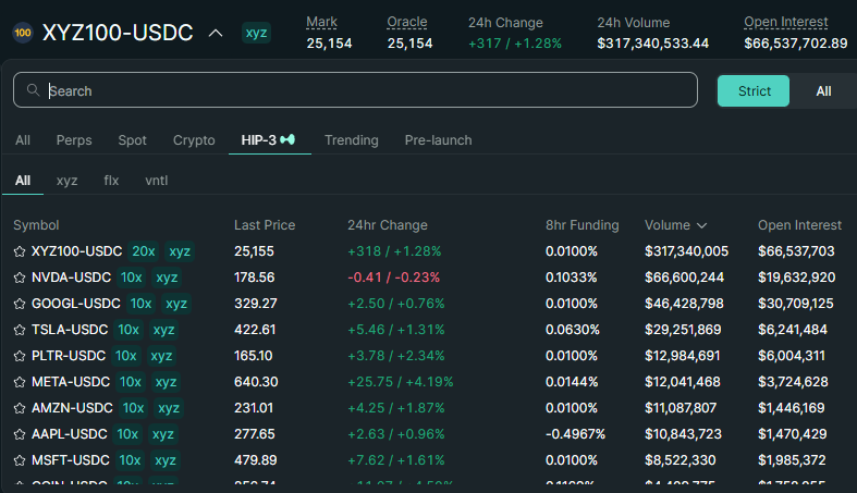 On top of XYZ100, trade.xyz added single-stock perps on the Magnificent-7 and other Nasdaq favourites: NVIDIA, Tesla, Apple, Amazon, Google, Microsoft, Meta, and Palantir. On November 25, the combined 24-hour volume on HIP-3 across trade.xyz surpassed $500 million, with XYZ100 accounting for around $317 million.