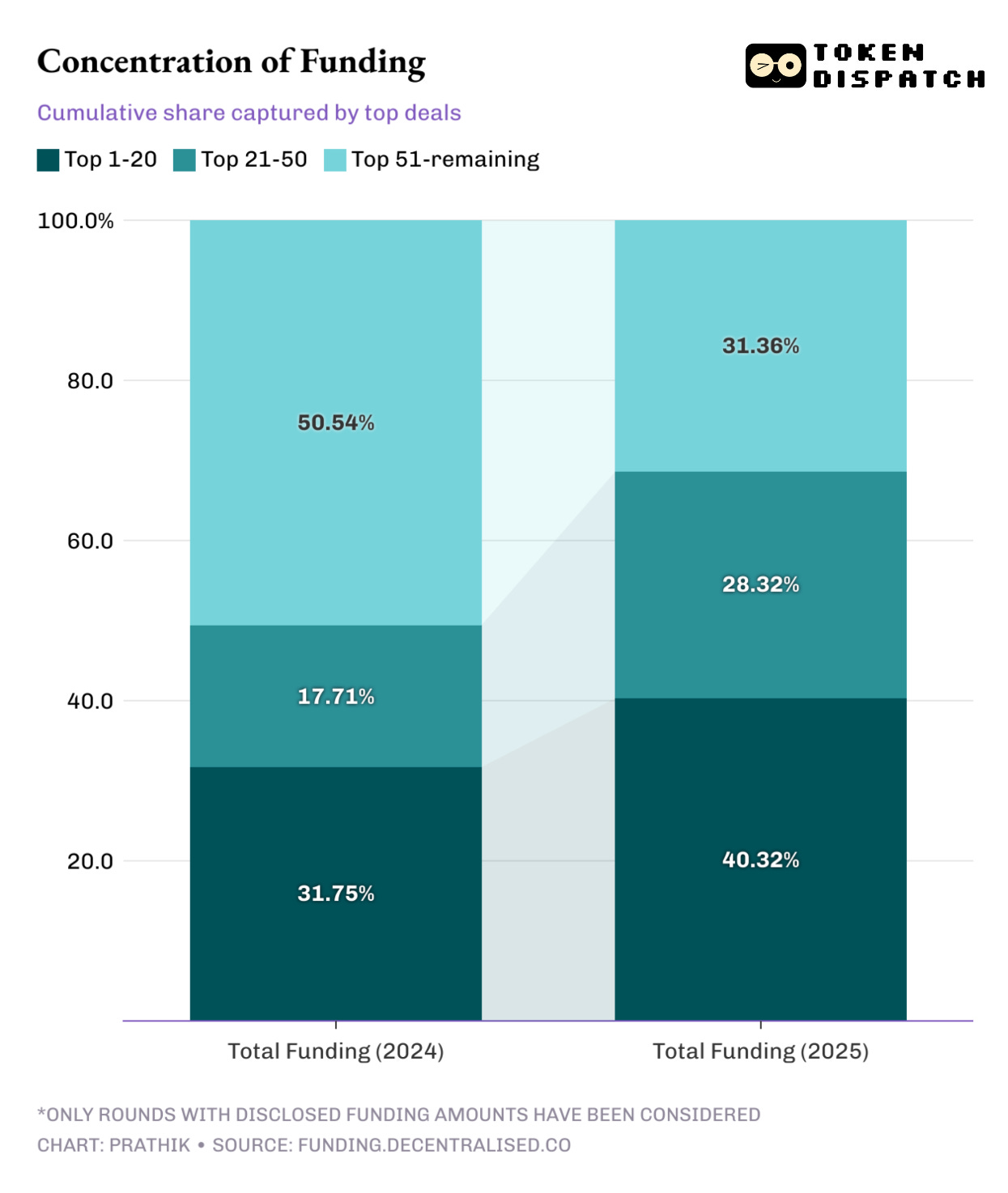 The top 20 rounds captured 40% of all 2025 funding, compared to 32% in 2024. Zoom out to the top 50 rounds, and their share swells from 49% in 2024 to 69% this year.