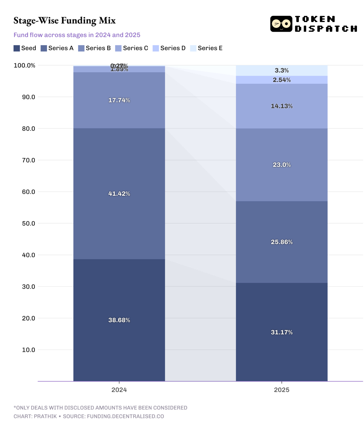 Seed and Series A rounds lost share, while the later stages gained a share of the overall funding. Approximately 57% of all funds were invested in the early stages (Seed and Series A) of crypto projects, compared to 80% in the first nine months of 2024.