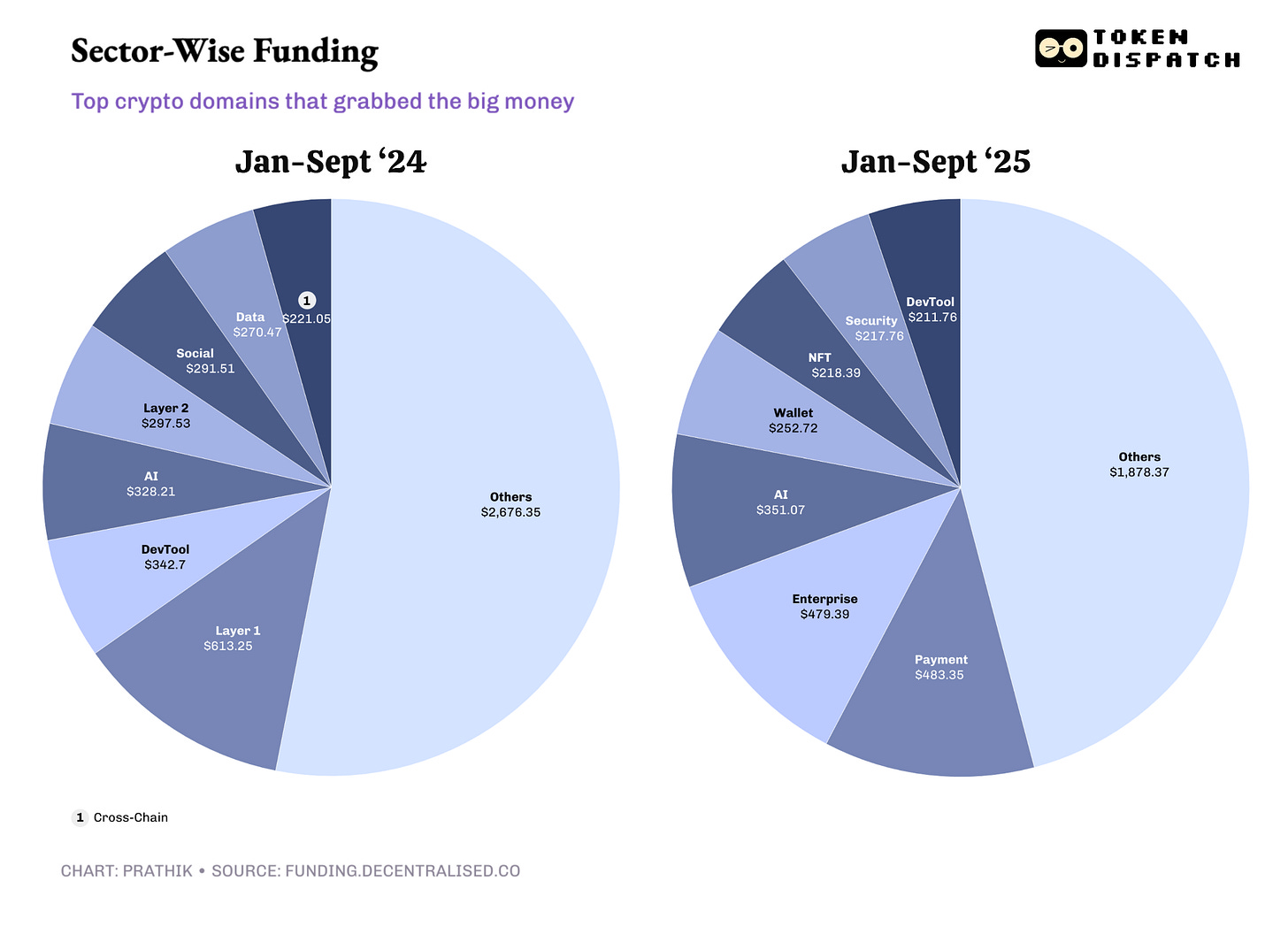 For founders, the message is that if you are building in the domains of AI, payments, enterprise infrastructure and real-world tokenisation (RWA), then the cheques exist. Outside these domains, funding has dried up in areas such as Layer-1 and Layer-2 infrastructure, developer tools, and social, which formed the cream in 2024.