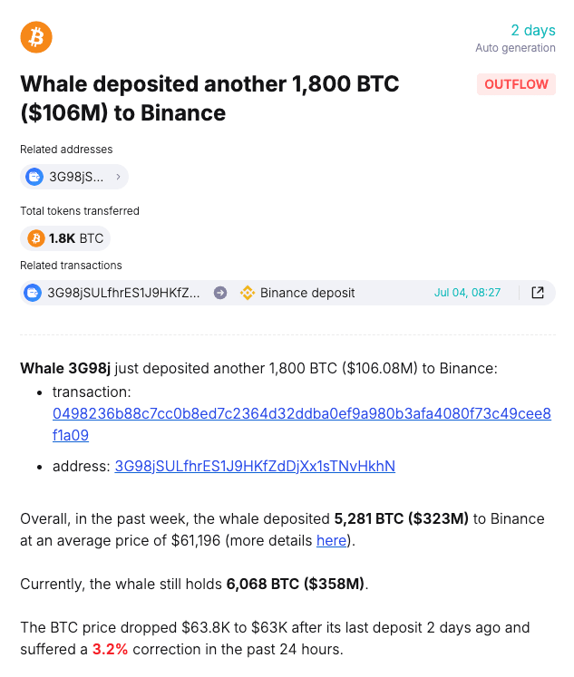 #1 A crypto whale transferred $423 million worth of Bitcoin to Binance in a series of transactions.