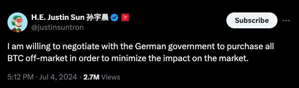 Tron founder Justin Sun has a big offer - buying Germany's Bitcoin holdings.