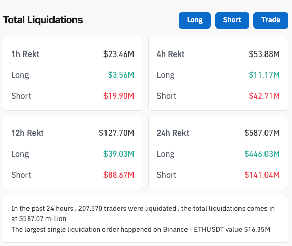 Close to $600 million worth of crypto dreams got liquidated in the past 24 hours.