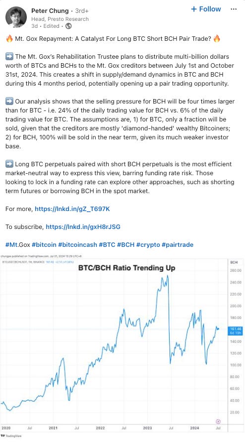 Mt. Gox will return $73 million worth of BCH to its creditors. This represents 24% of BCH's daily trading volume, making a significant price drop very likely.