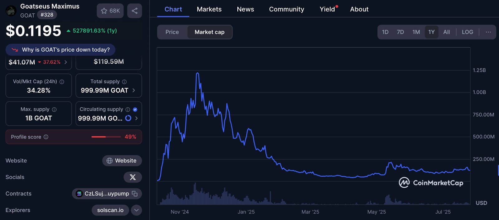 Took the crypto world by storm with its engagement on X, saw its market cap shoot up and seemed promising, until it wasnât. In just a month from its launch, its market cap touched $1.2 billion. From there, it dropped 90% in three months.